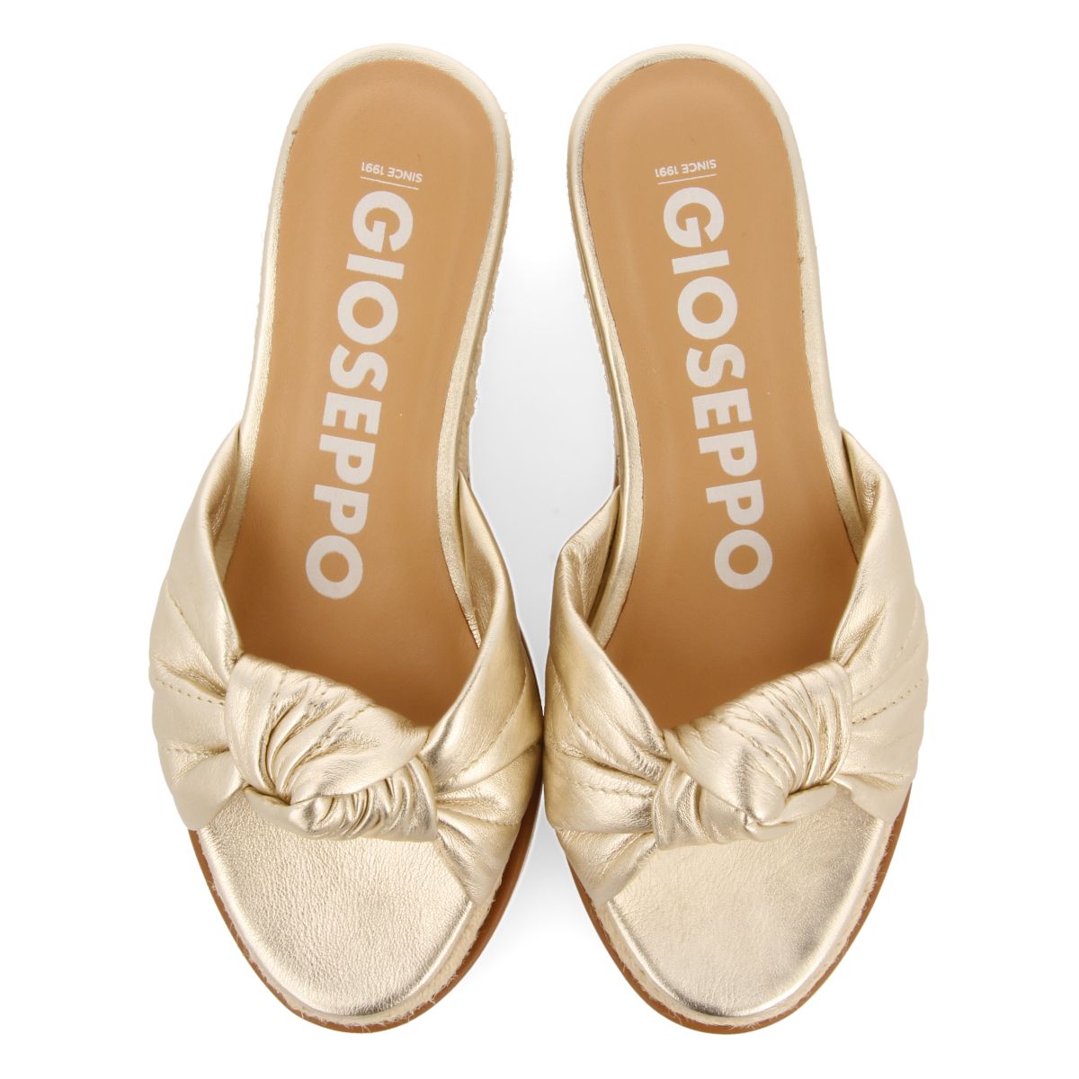 Ligeras y ultra cómodas: Sandalias tipo pala color platino con detalle de nudo. Cuña alta forrada con yute y plataforma blanca ligera. Plantilla de piel muy acolchada de látex para un mayor confort. Forro de piel curtida en un proceso de curtición más sostenible bajo los estándares de Leather Working Group. Piso flexible. No te pierdas la nueva colección de sandalias de tacón de mujer en Gioseppo Woman.