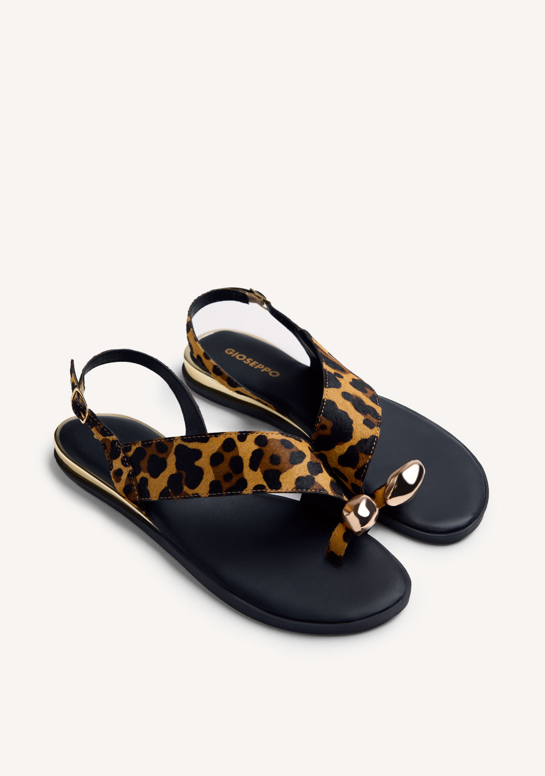 Sandalias planas de piel con estampado de leopardo tipo pelo. Anillo con joya y cerco metalizado en acabado oro. Cuentan con planta acolchada y cierres ajustables en el tobillo.