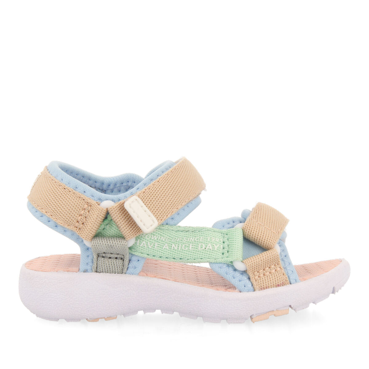 SANDALIAS DE ASPECTO DEPORTIVO COLOR TURQUESA CON CINTAS MULTICOLORES PARA BEBÉ ROCHEDO