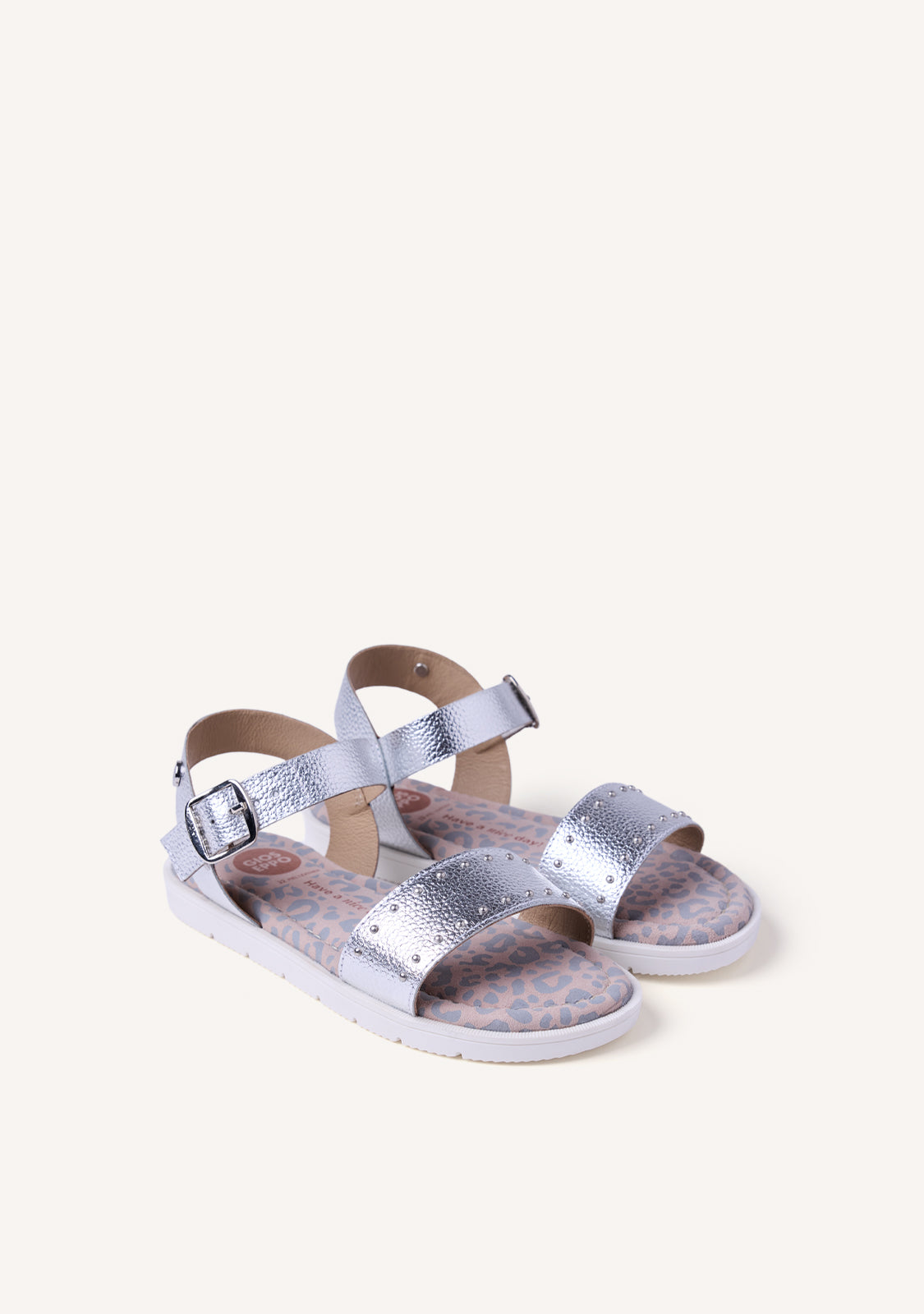 Sandalias de piel con acabado metalizado y detalle de tachas. Cuentan con cierres ajustables en el tobillo. Planta estampada de piel serraje, suave y acolchada. Las posibles arrugas y diferencias en la piel o en el montado entre ambos pies son debidas al proceso artesanal y al uso de pieles naturales.
