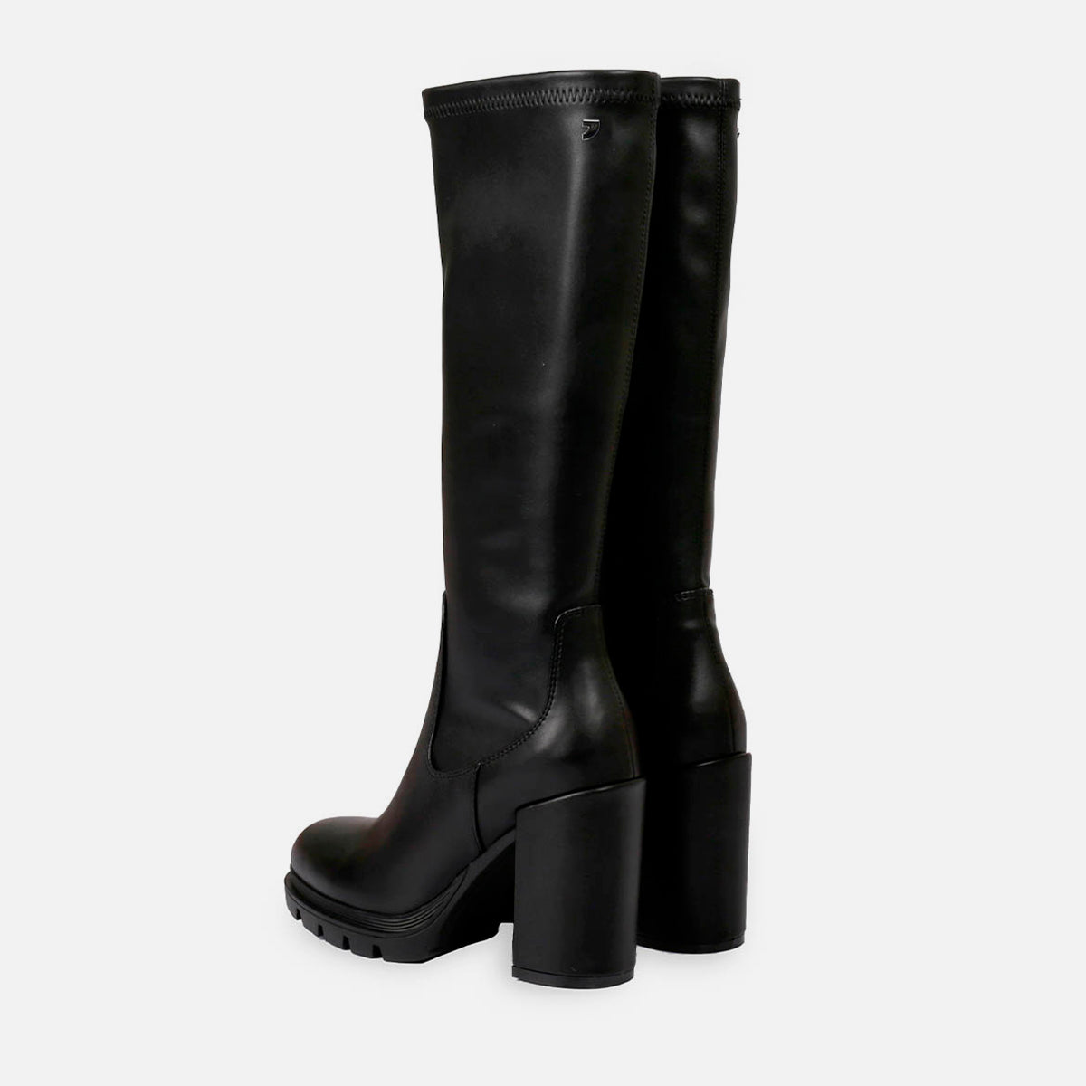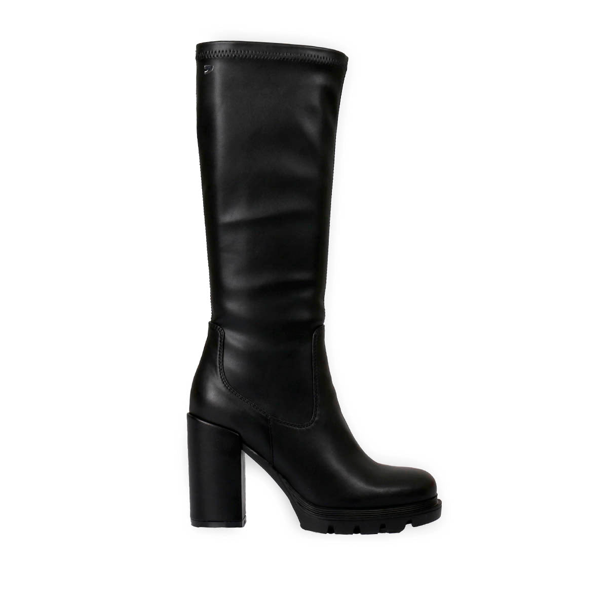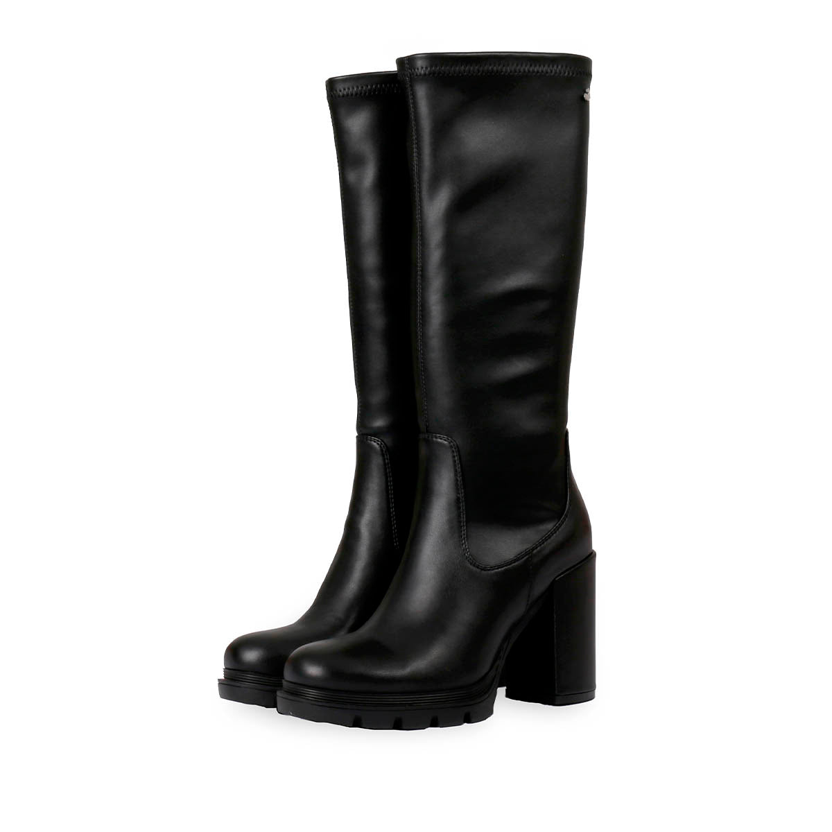 La mejor elección para tu día a día. Bota negra alta lisa de punta redondeada con plataforma track y tacón alto de material elástico. Planta de piel transpirable con acolchado confortable y forro textil poliéster transpirable. Piso de caucho TPR.