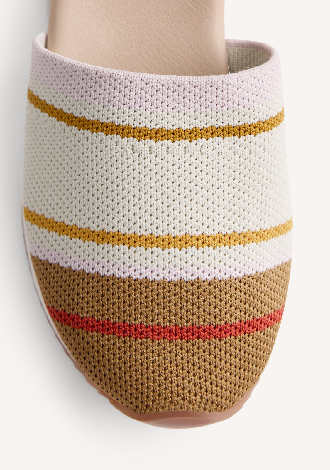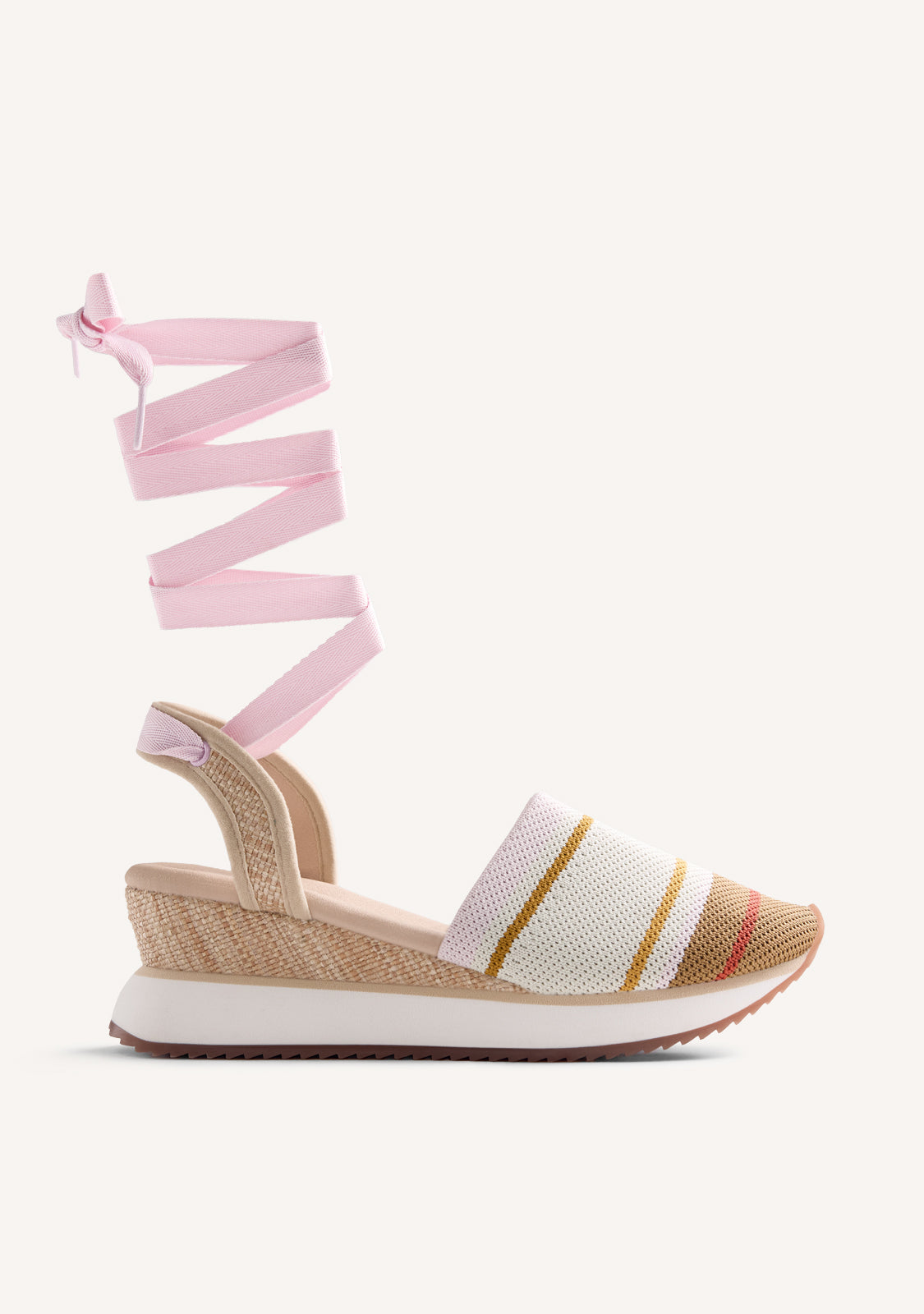 Zapatillas valencianas destalonadas con cuña de rafia. Estampado de rayas con contrastes de color. Cuentan con planta acolchada. Atadas con lazos. Altura cuña: 5,5 cm.