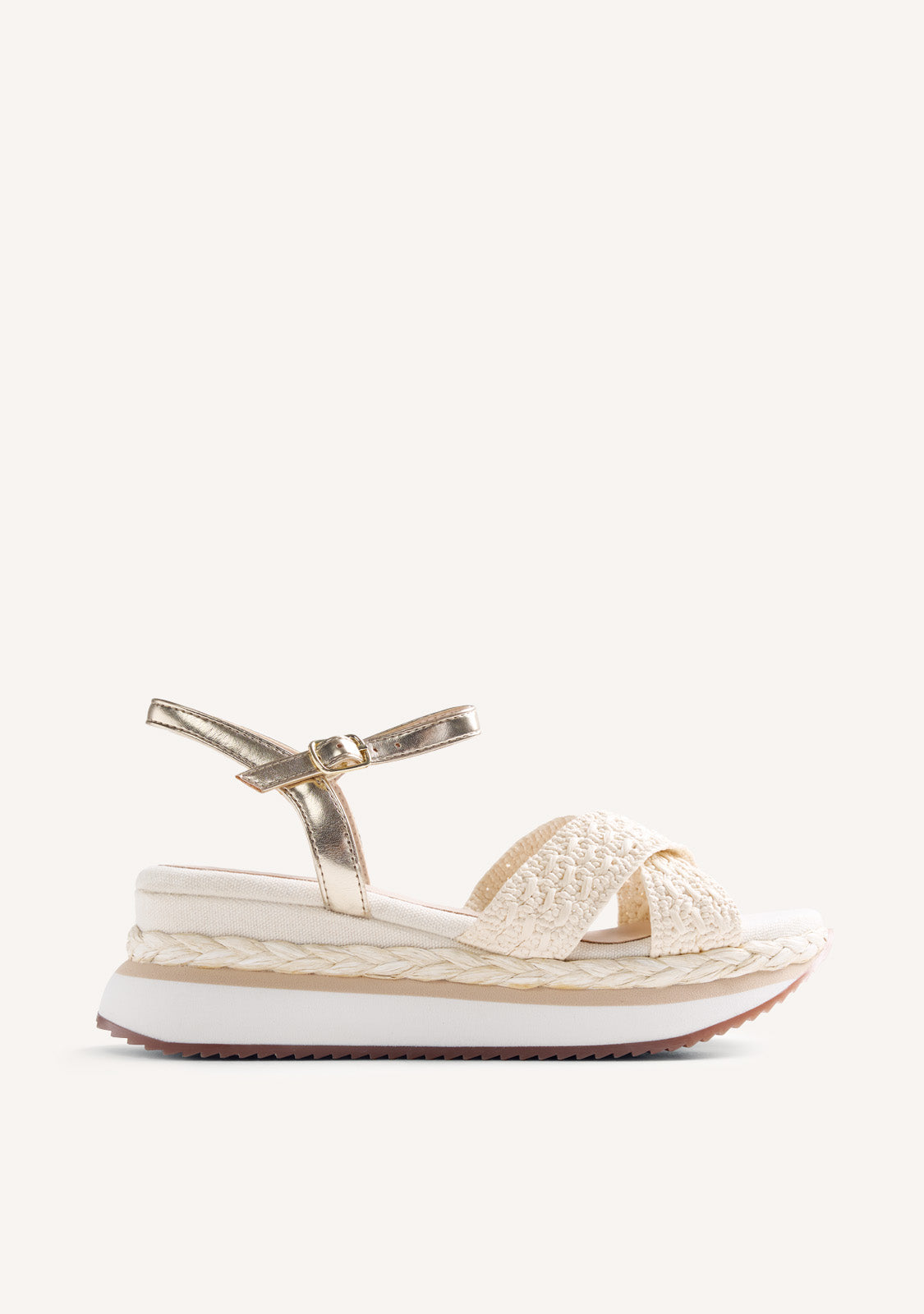 Sandales en raphia tressé. Elles sont dotées d'une semelle compensée doublée de coton et de brides réglables à la cheville. Hauteur du talon : 5,5 cm. Tige et doublure en raphia et polyuréthane. Semelle intérieure douce en coton et polyuréthane. Semelle intermédiaire légère en EVA. Semelle extérieure en TPR.