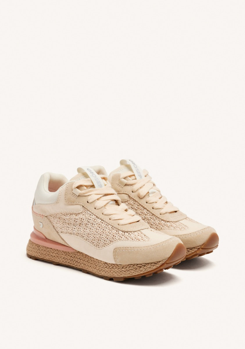 Baskets en cuir avec semelle compensée intérieure et raphia. Semelle intérieure anatomique. Hauteur de la semelle compensée : 3 cm. Composition : -Cuir. -Raphia. -Tige en PU. -Semelle en caoutchouc. -Semelle intérieure et doublure en polyester recyclé respirant avec garantie certifiée Global Recycled Standard.
