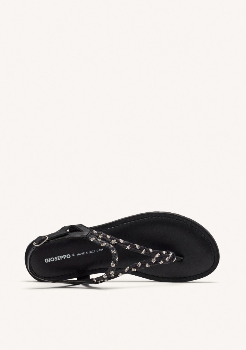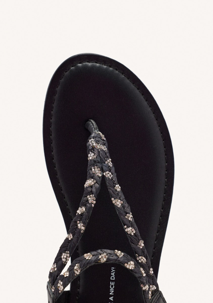 Sandali piatti in pelle in stile greco con cinturini in rafia lucida. Hanno una suola morbida e imbottita in pelle scamosciata. Chiusura regolabile sul tallone. Composizione: -Pelle. -Raffia. -Suola in pelle conciata in concerie con certificazione sostenibile Leather Working Group. -Suola flessibile in TPR.