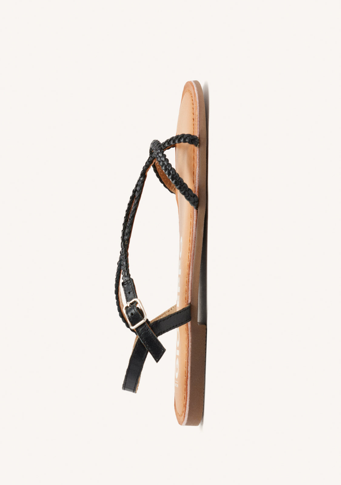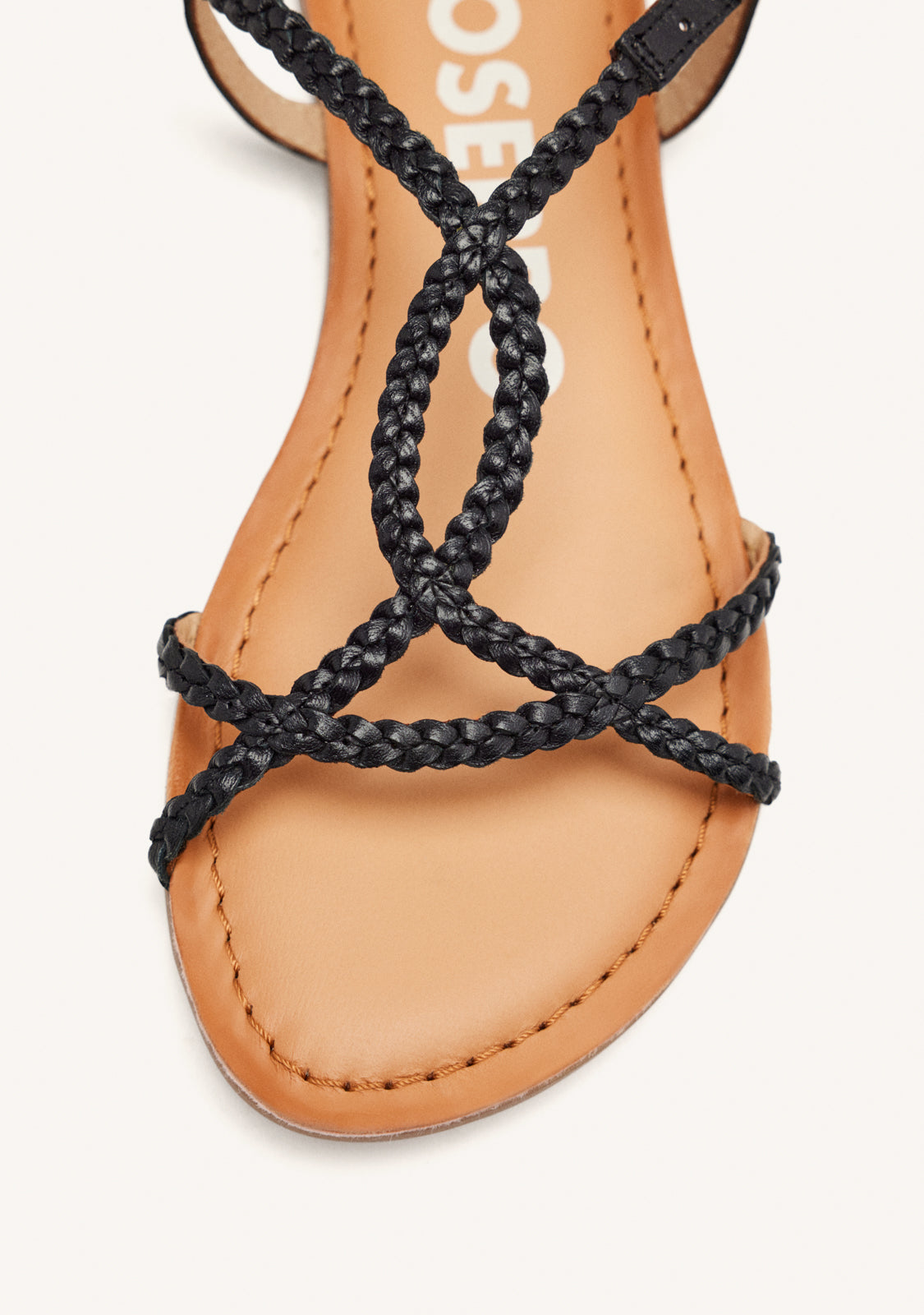 Sandali con strisce sottili intrecciate in pelle colore nero. Chiusura alla caviglia con fibbia. Sottopiede in pelle con imbottitura in lattice dal tatto morbido per garantire un maggiore comfort. Suola di pelle conciata in concerie che seguono un protocollo di concia più sostenibile secondo gli standard del Leather Working Group. Suola flessibile. Un basic che non passa di moda stagione dopo stagione.