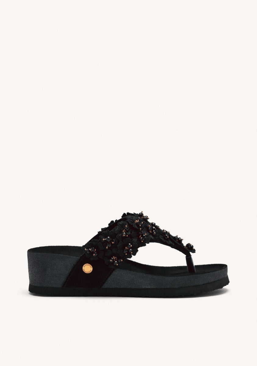 Sandali con zeppa e decorazione di perline. Hanno una suola anatomica in microfibra. Altezza zeppa: 5 cm. Composizione: -Suola leggera in EVA. -Suola in microfibra morbida e traspirante. -Fodera in poliestere. -Tomaia in PU.