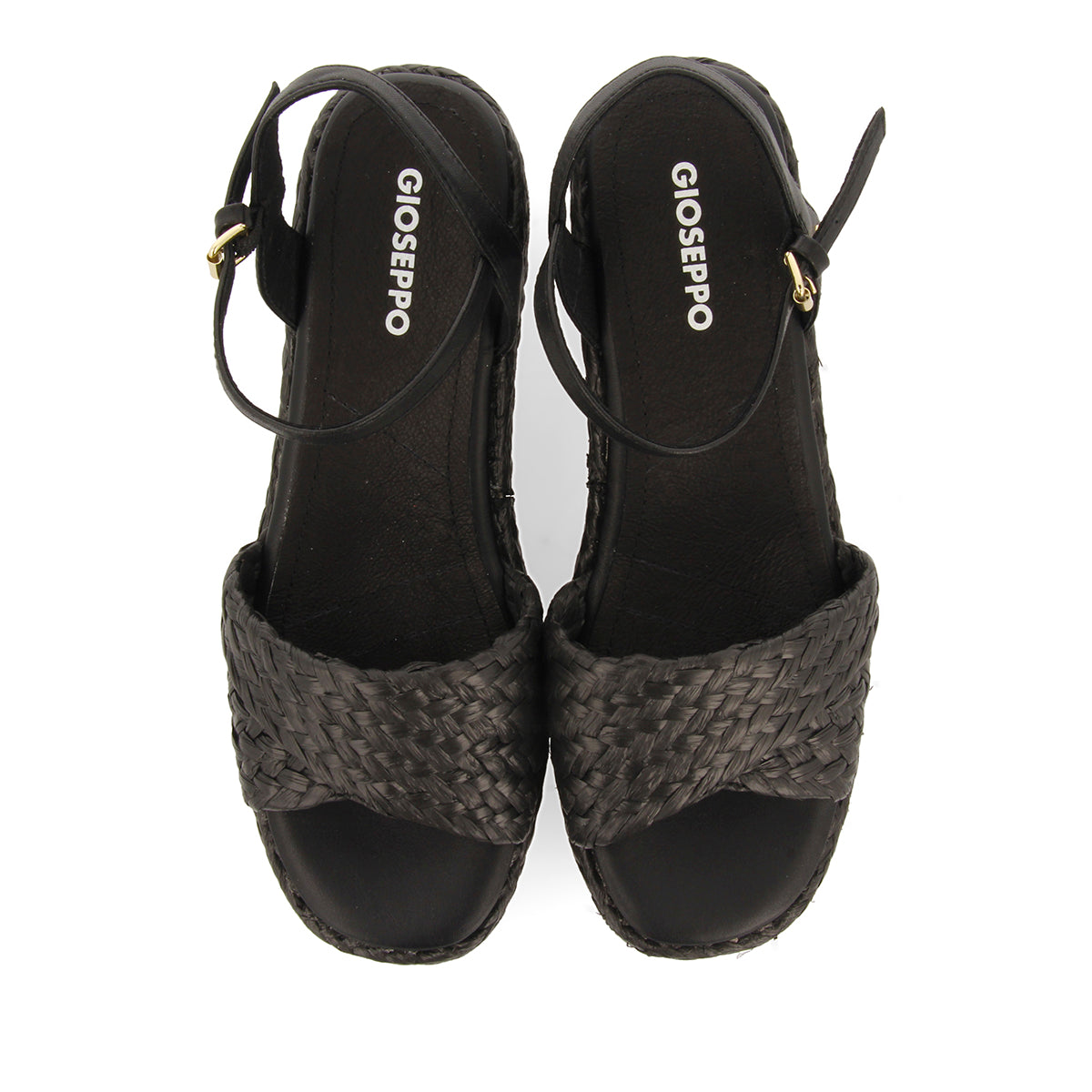 Comodissime! Sandali in rafia nera con plateau e chiusura regolabile alla caviglia. Suola imbottita per un maggiore comfort. Non perderti la nuova collezione di sandali con plateau da donna di Gioseppo Woman.