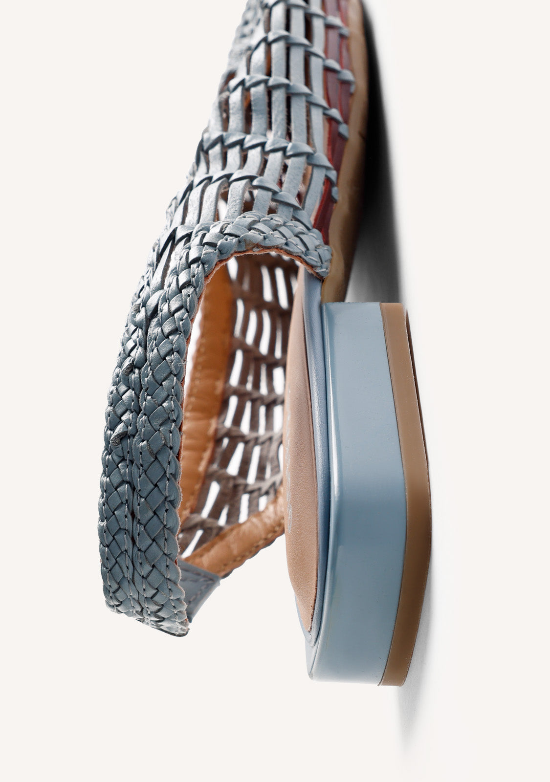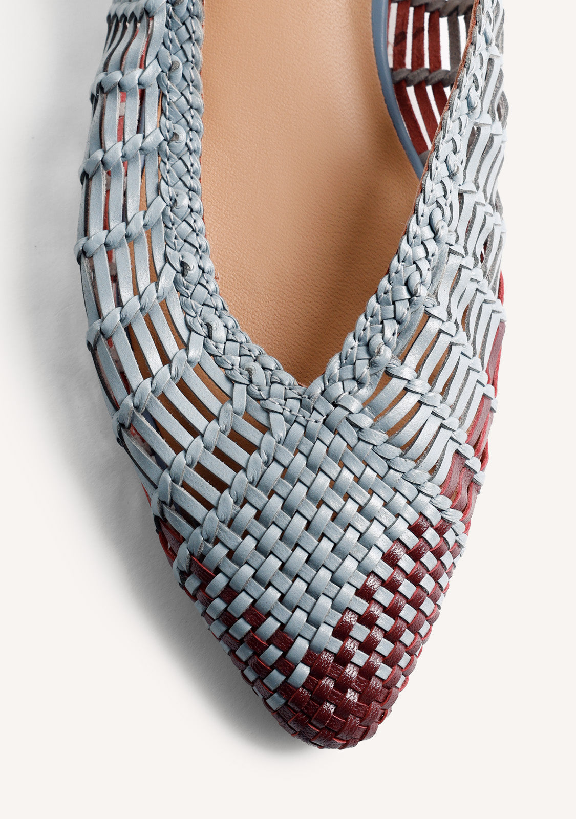 Ballerine aperte in pelle con intreccio bicolore fatto a mano. Punta affusolata. Cinturino alla caviglia. Altezza tacco: 1,5 cm. Tomaia, fodera e soletta in pelle. Suola flessibile in TPR.