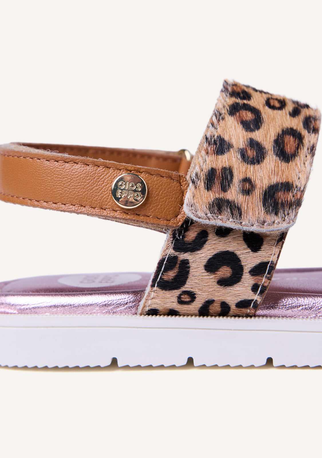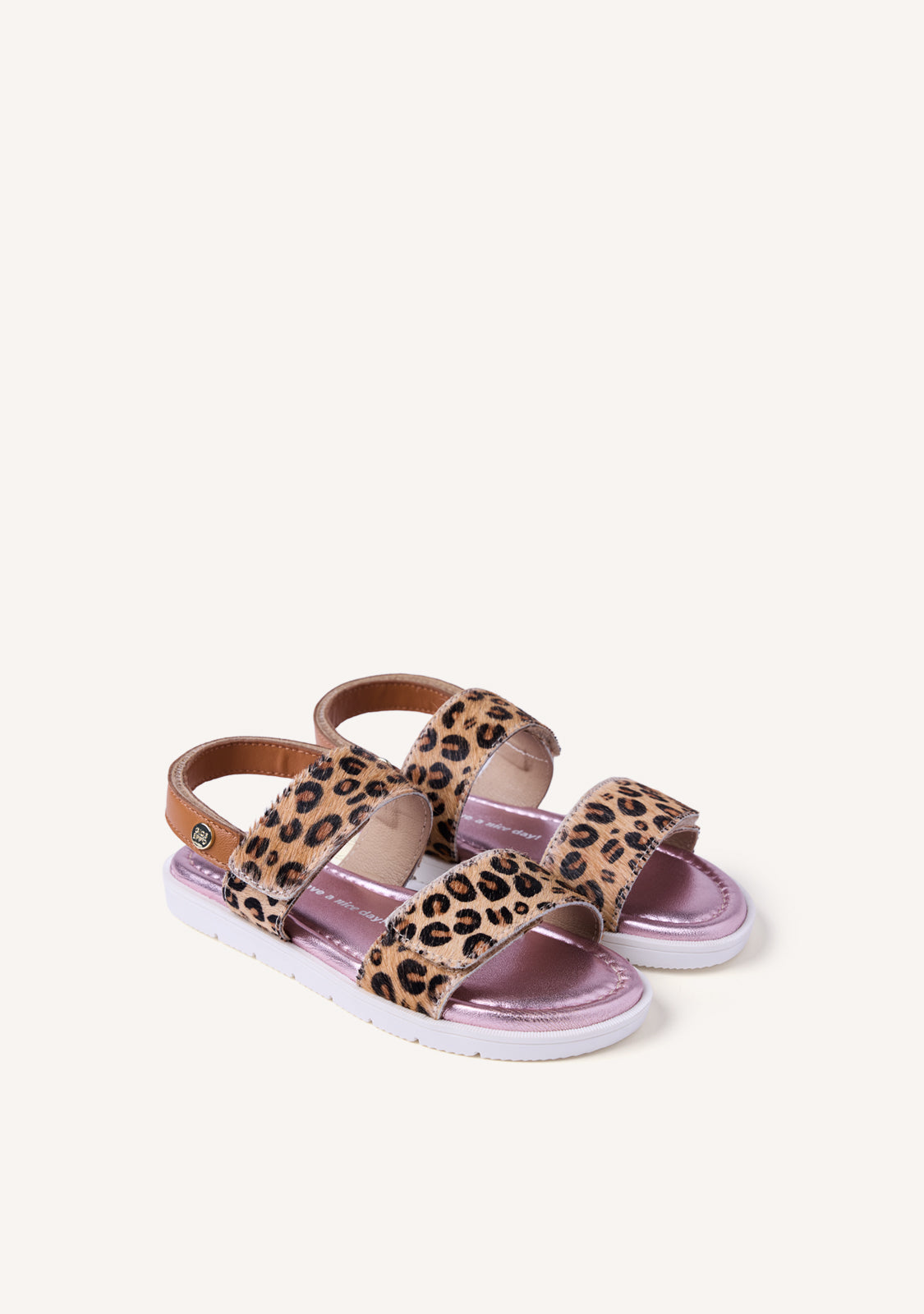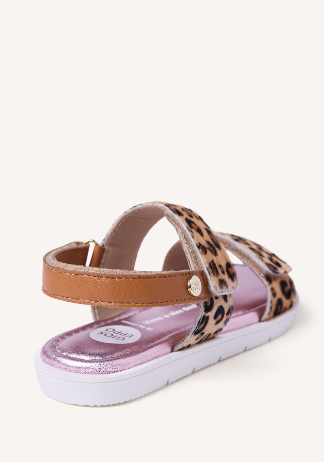 Leopard-print leather sandals. They feature adjustable ankle straps and a padded metallic sole. Possible creases and differences in the leather or the fit between the feet are due to the artisanal process and the use of natural leathers. Leather upper, lining, and sole. Flexible TPR sole.