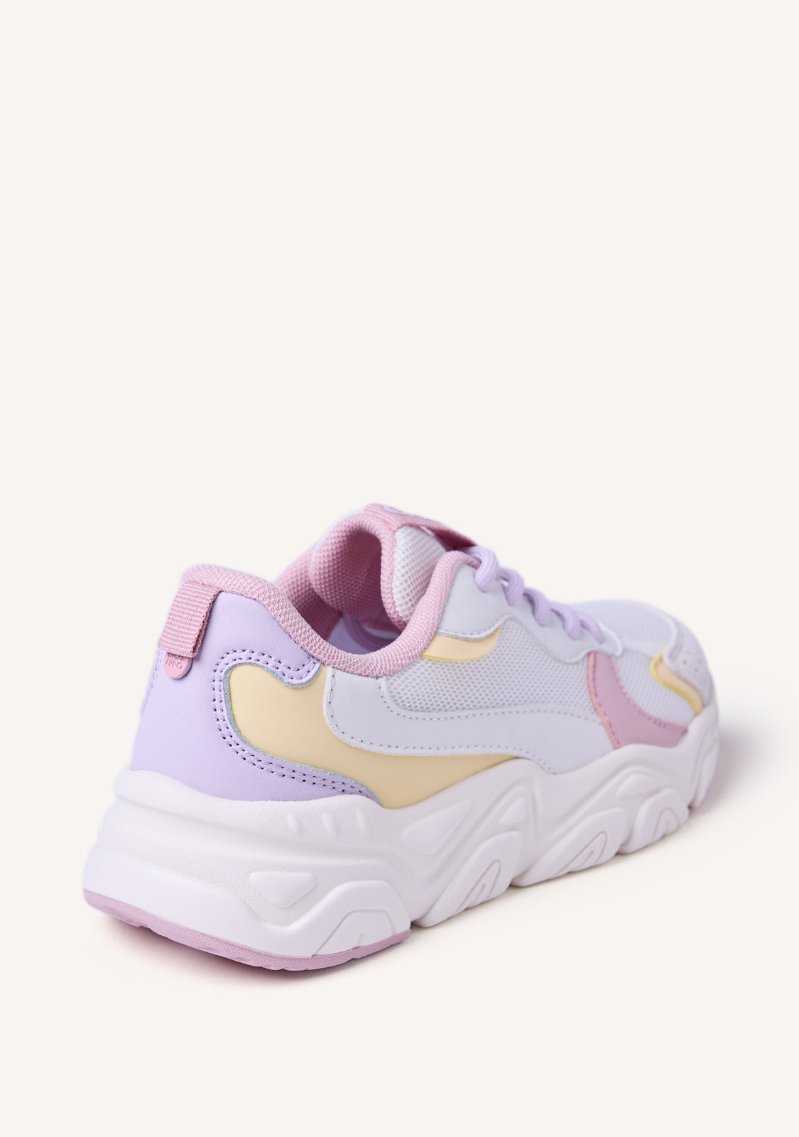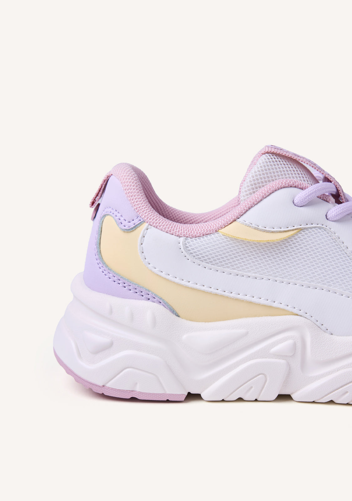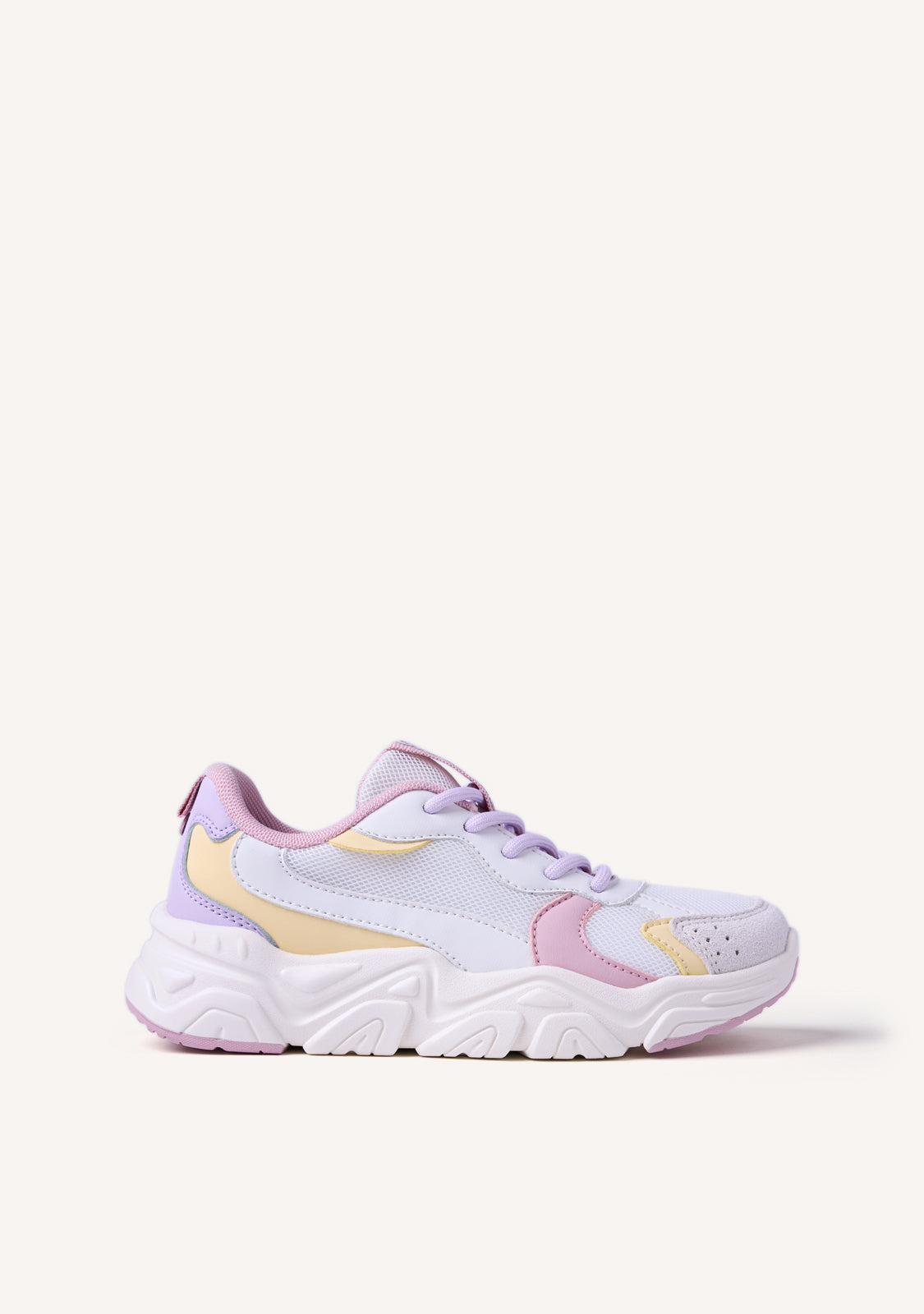 Mesh athletic sneakers with colourful accents. They feature a Gio Memory Effect insole, a memory foam system that cushions and softens the foot. They feature adjustable instep closures. This model stands out for its lightness. The upper is made of leather, breathable polyester, and polyurethane. The lining and insole are breathable polyester. The sole is made of fylon, a shock-absorbing, non-slip, and ultralight material.