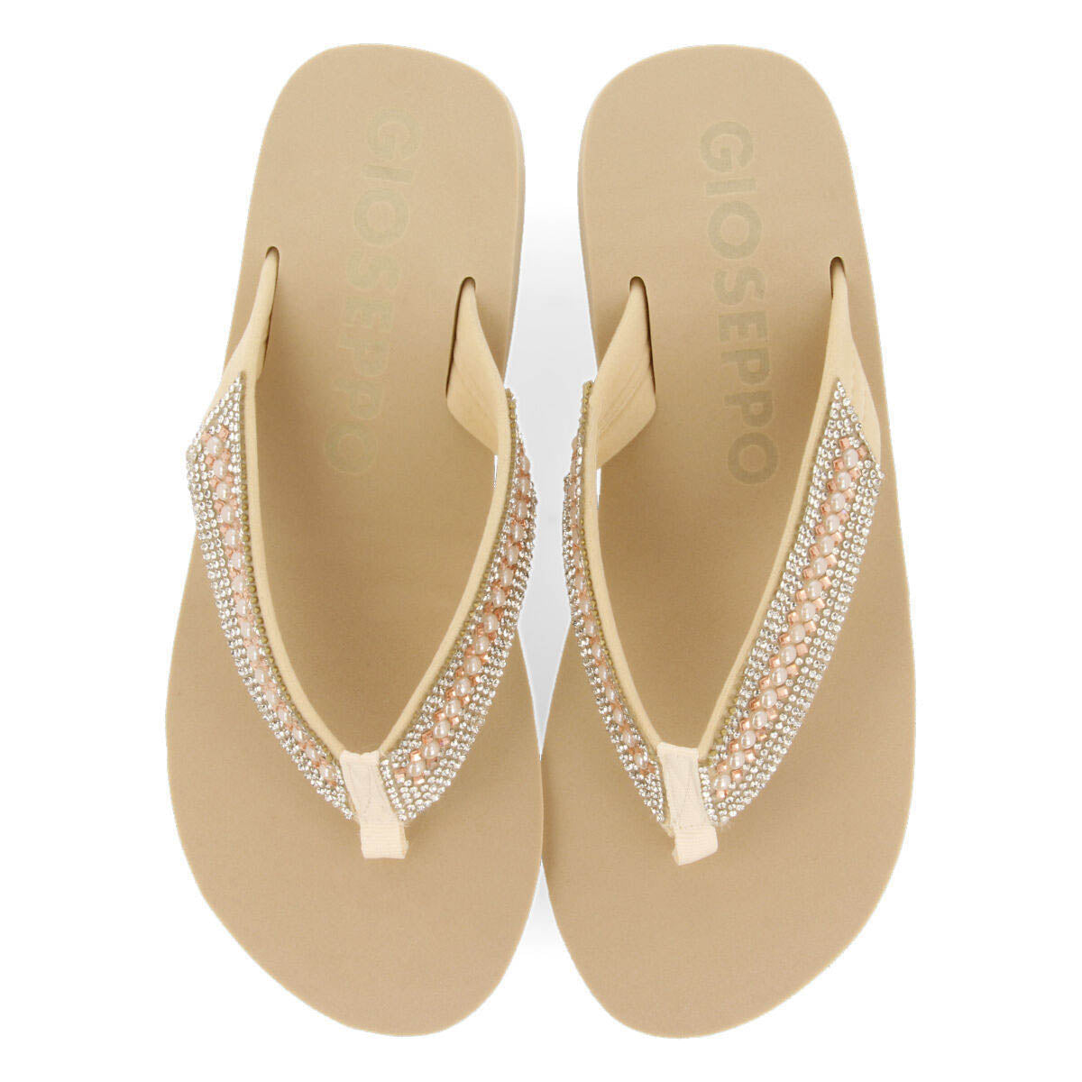 Comfortable, lightweight and stylish every day of the year. Beige toe-post sandals with EVA wedges. Featuring straps with mini decorative pearls. EVA insoles and very flexible EVA soles. Don't miss out on the latest women's sandals in the new Gioseppo Woman Collection.