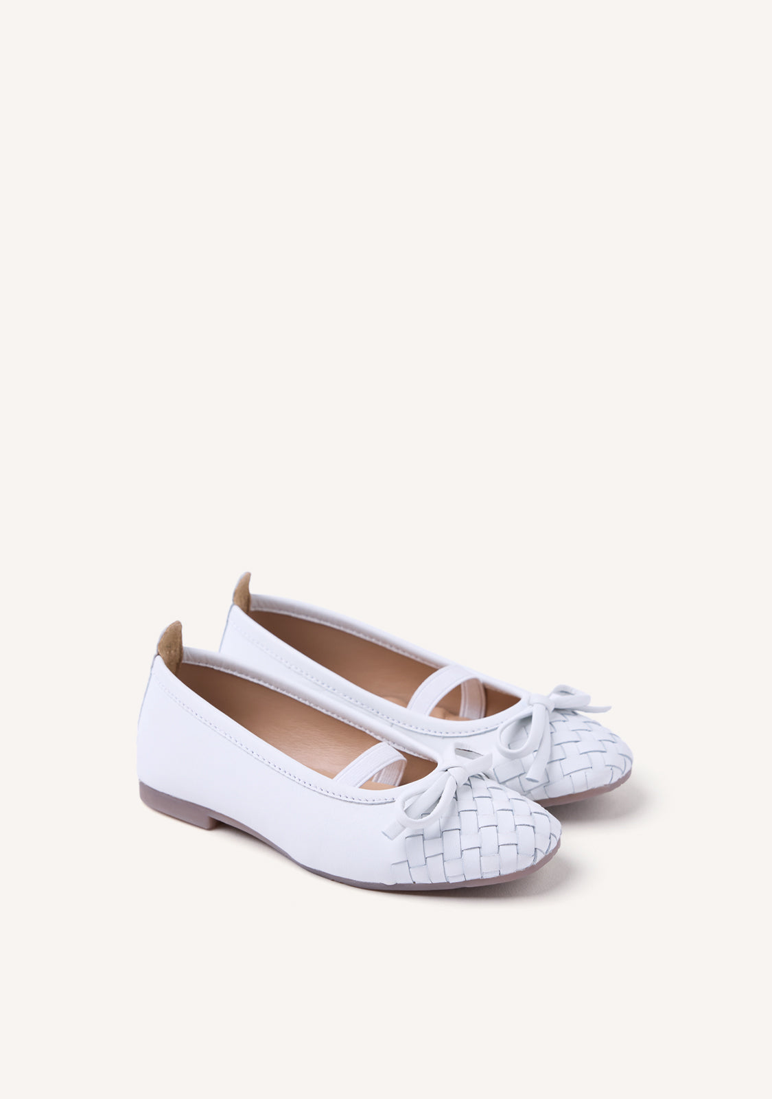 Braided leather ballet flats with a metallic finish and bow detail. Square toe. They feature a padded insole and elastic instep. Possible creases and differences in the leather or construction between the feet are due to the artisanal process and the use of natural leathers. Leather upper, lining, and insole. Flexible TPR sole.