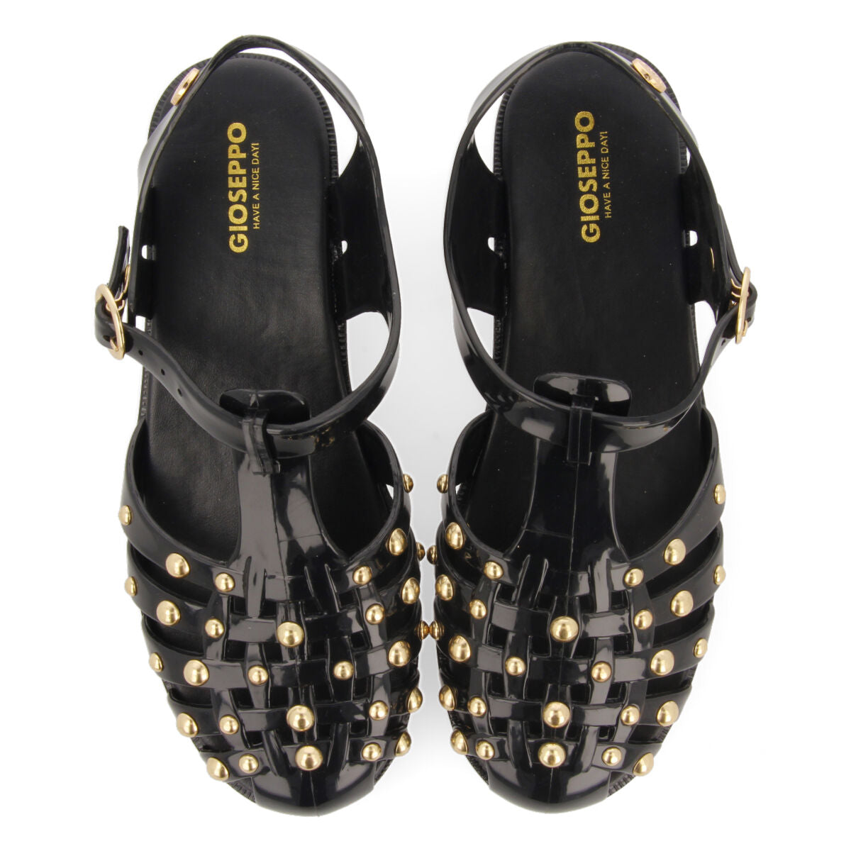 Maximum comfort all summer long. Black multi-strap sandals with a shiny finish and decorative mini studs. Buckle fastening at the ankle. Very soft PVC insoles and lining. Very light and flexible PVC soles. Discover this season's latest sandals in the new Gioseppo Woman Collection.