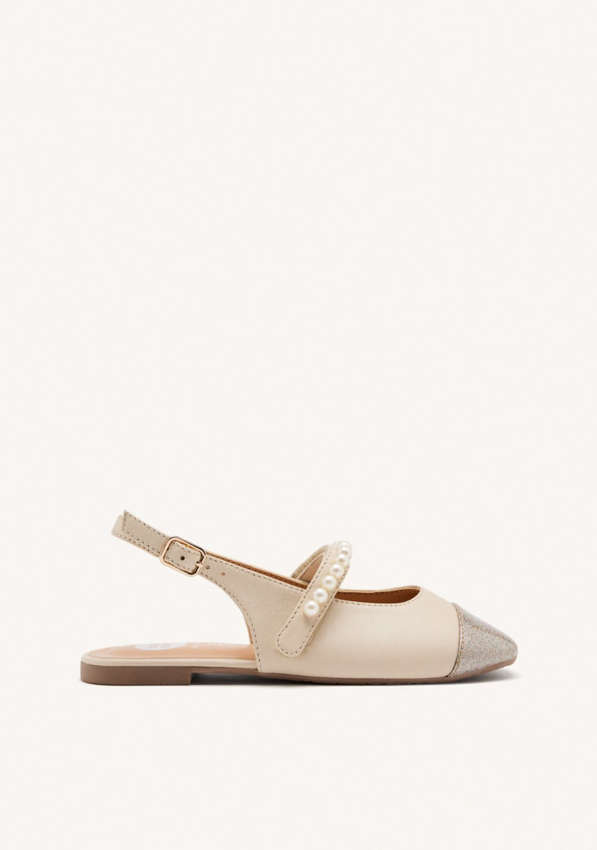Leather backless ballet flats with pearl embellishment. They have a padded insole and adjustable heel closure. Composition: -Leather and polyurethane upper. -Polyurethane lining and insole. -Flexible TPR sole.