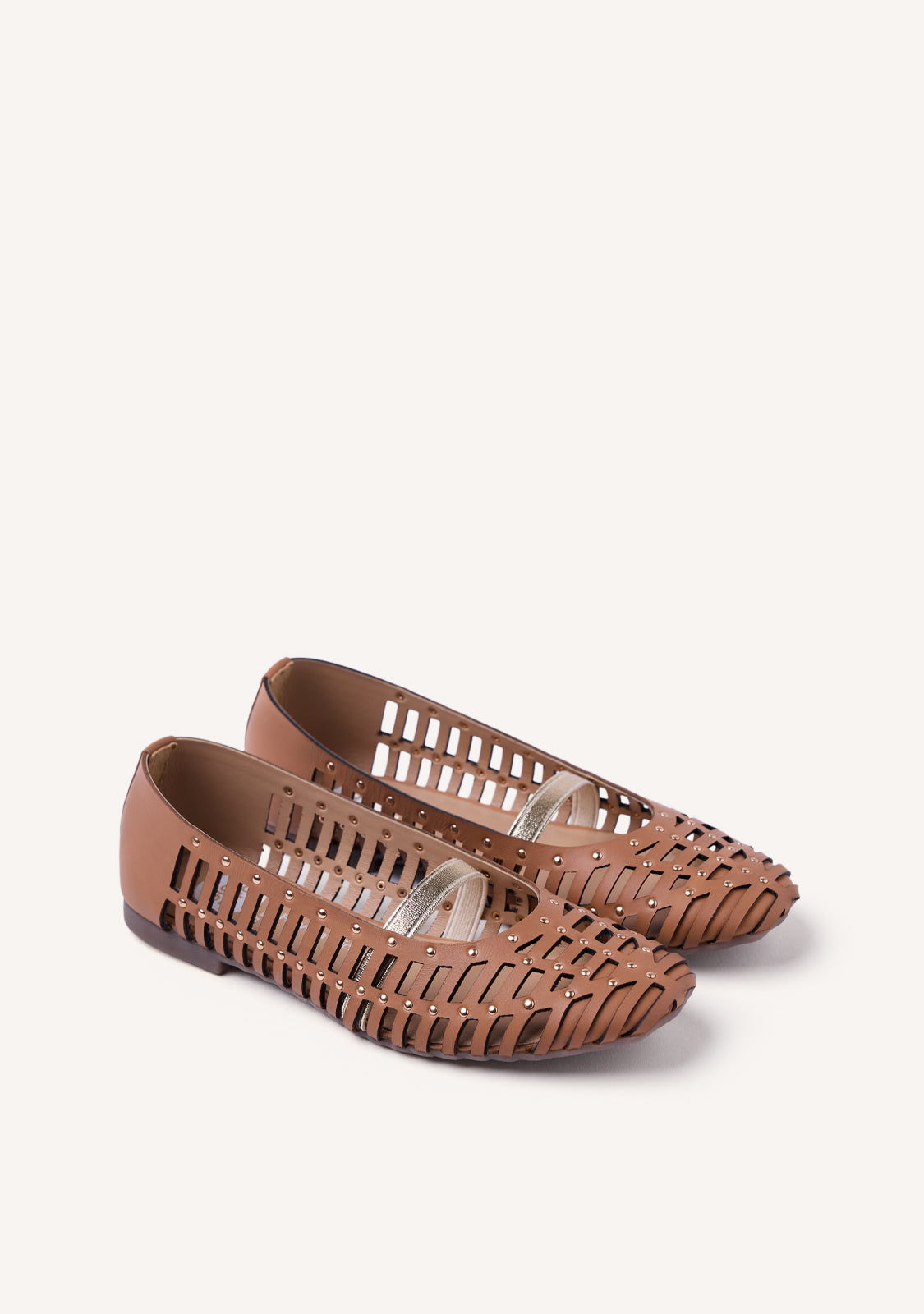 Open leather ballet flats with gold-finished studs. Round toe. Cushioned insole. Possible creases and differences in the leather or the construction between the feet are due to the artisanal process and the use of natural leathers. Leather upper, lining, and insole. Flexible TPR sole.